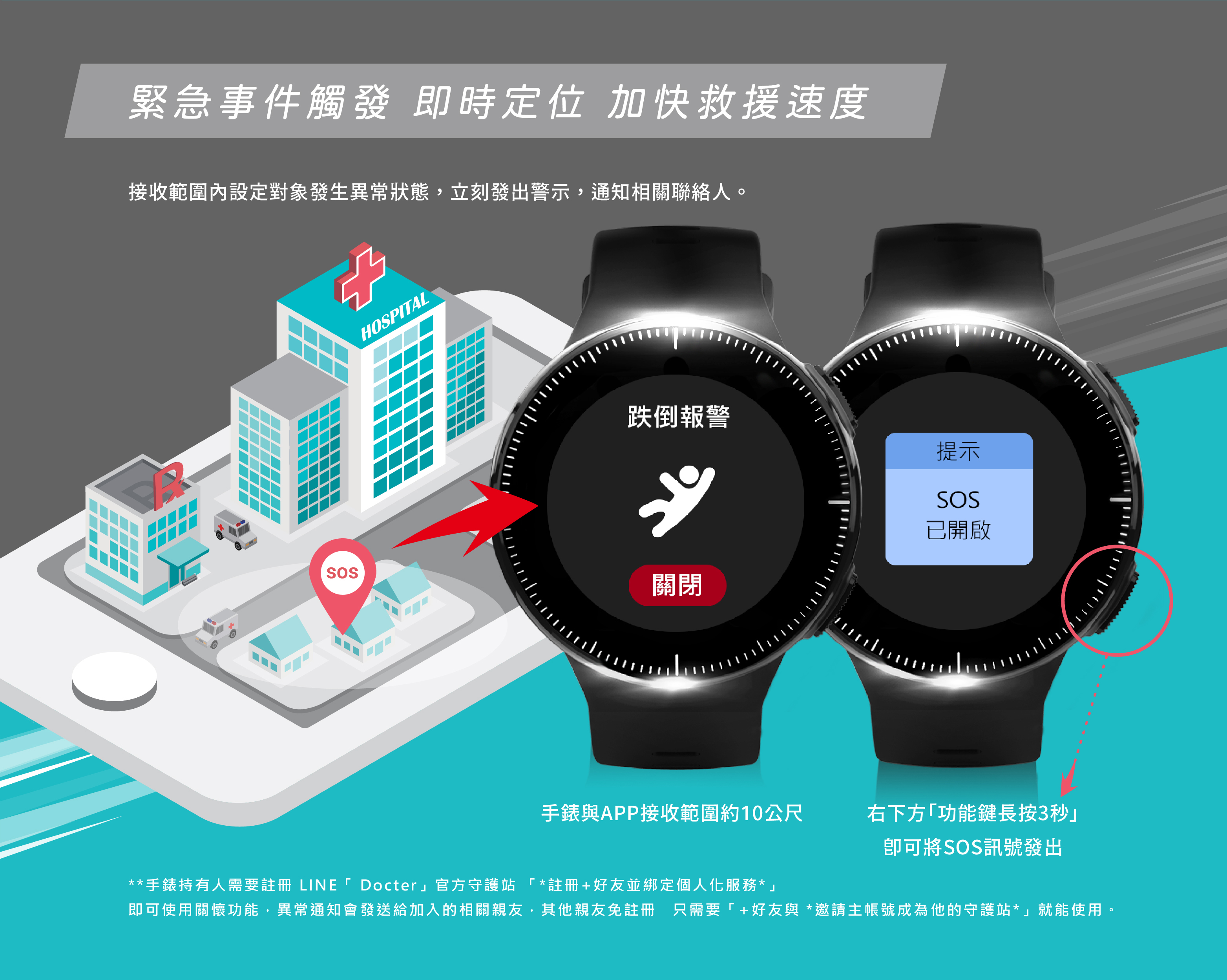 跌倒偵測/SOS監測/心率監測 搭配專屬APP ”Docter+” 並開啟APP內”即時監測”功能