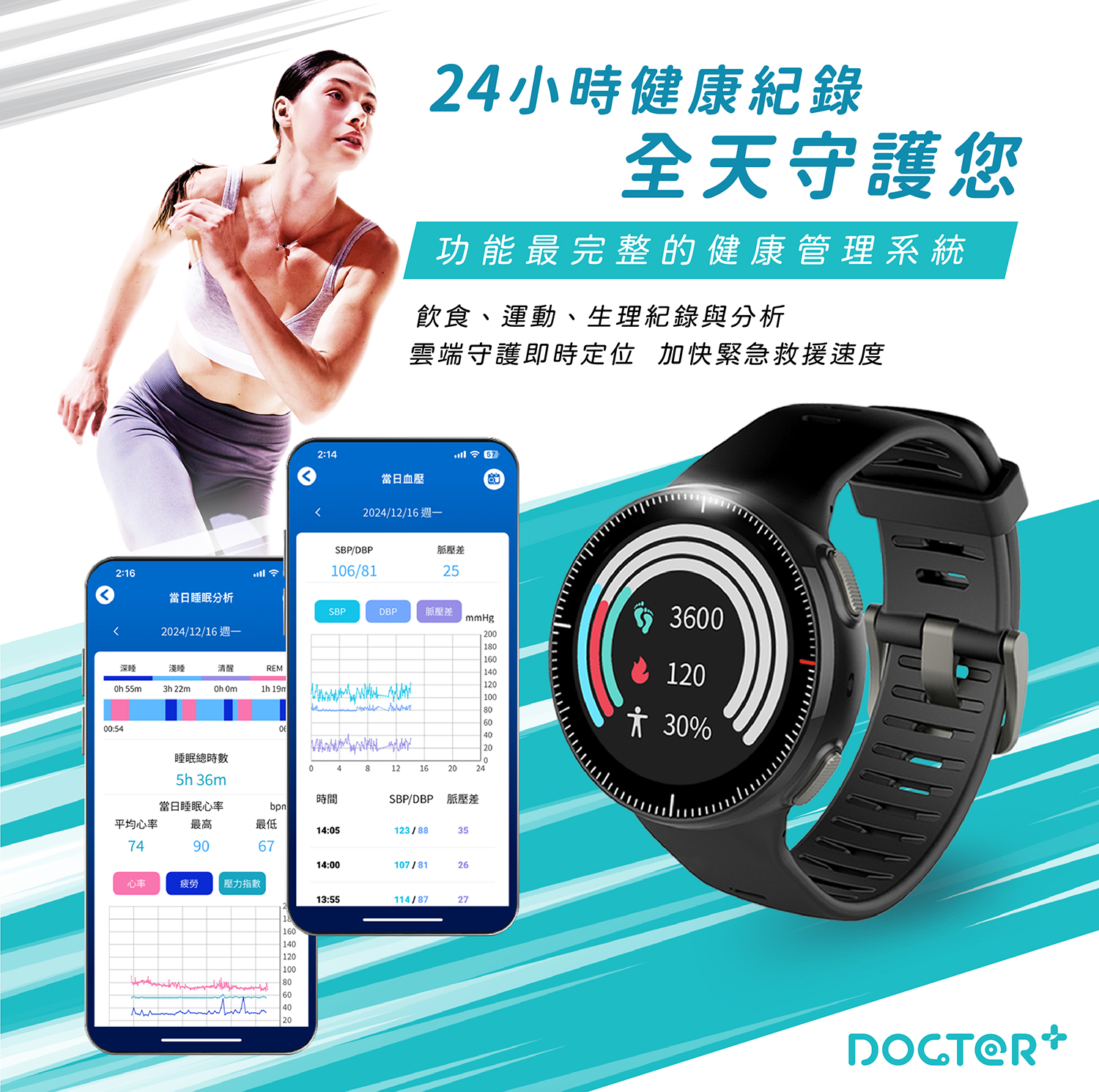 跌倒偵測/SOS監測/心率監測 搭配專屬APP ”Docter+” 並開啟APP內”即時監測”功能