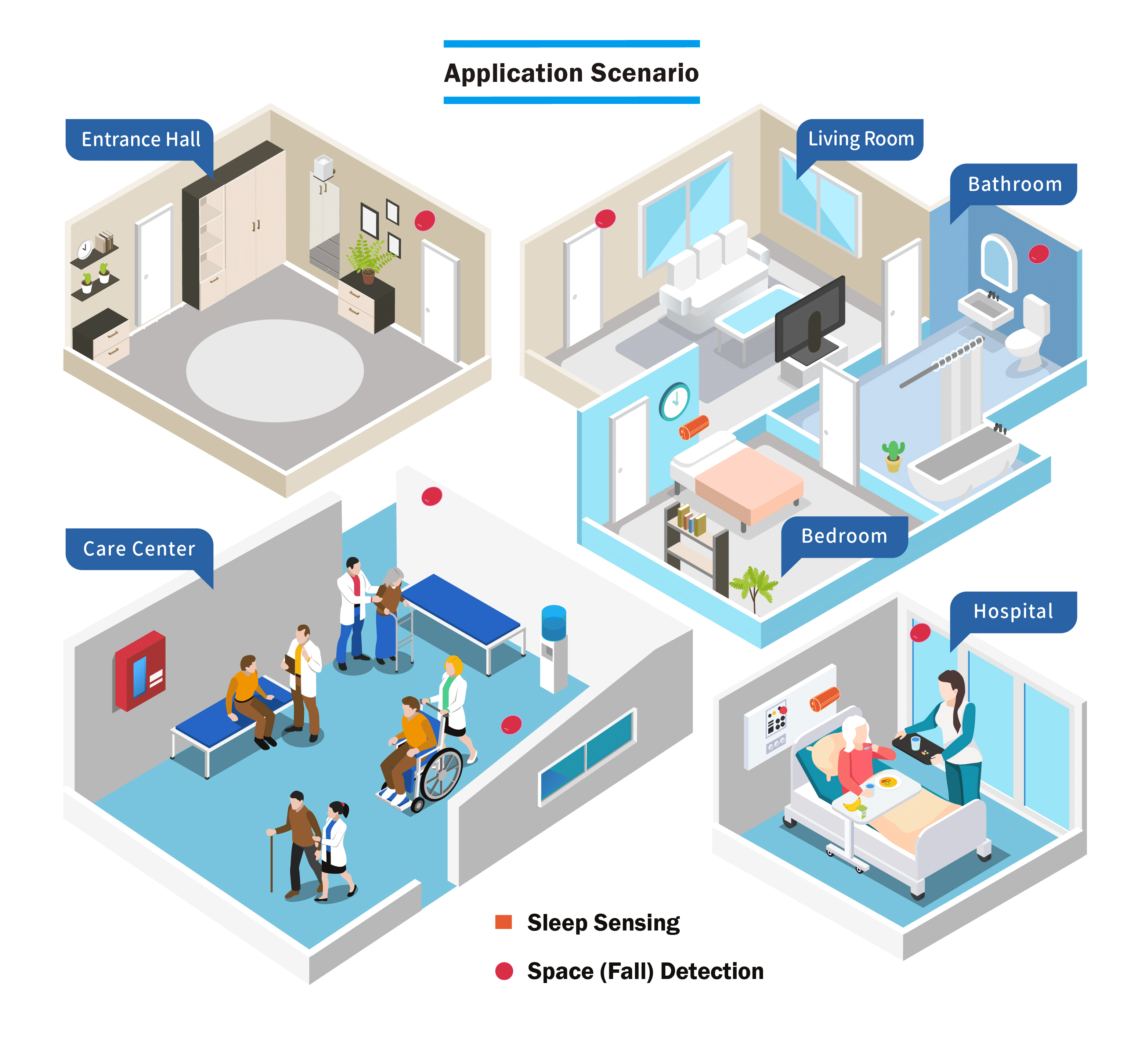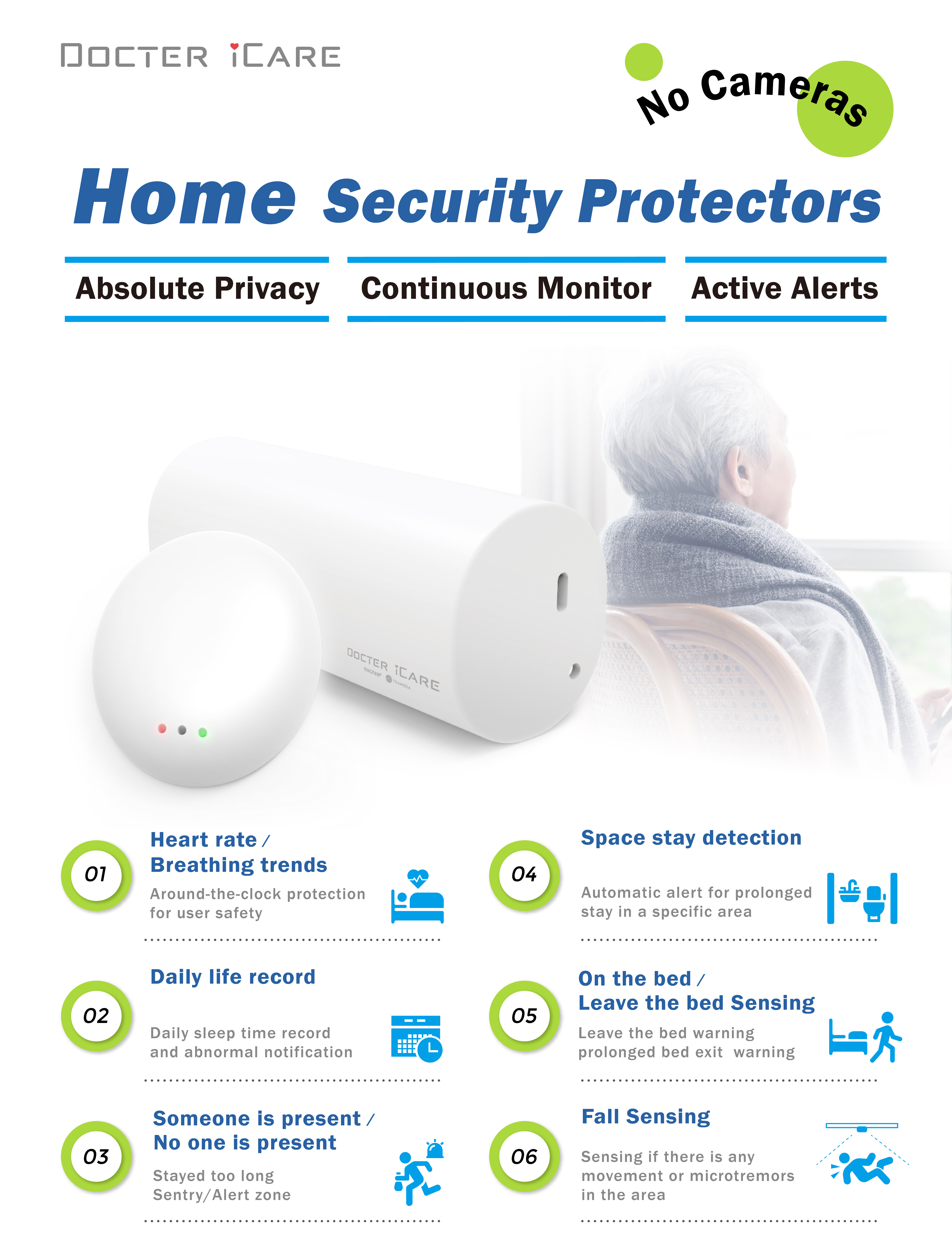 Millimeter-wave radar is unaffected by temperature, humidity, noise, airflow, dust, or lighting conditions, enabling non-contact measurement of breathing and heart rate.The device is installed approximately 1 meter from the head of the bed, is easy to install, and does not require special installation.Additionally, it features infrared temperature measurement to continuously monitor the user’s body surface temperature, assisting with long-term bed information or vital sign trends recording. Institutions can use cloud-based services for real-time monitoring or historical record review, allowing for proactive prevention, reducing caregiving labor, and offering immediate care and emergency assistance. This system is beneficial for hospitals, elderly care institutions, sub-health management, high-risk elderly, and individuals living alone.